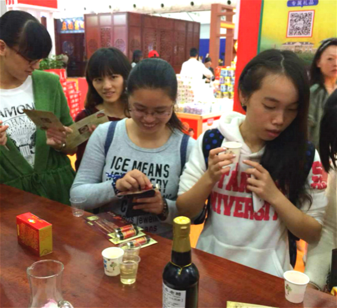 隨著時(shí)間的推進(jìn)展會迎來了一波波的游客和采購商,永春老醋公司展區(qū)也隨著涌入的人群熱鬧了起來。游客們一邊聽著講解人員介紹永春老醋一邊品嘗用老醋調(diào)制的醋飲料,在贊不絕口中加深了對老醋的了解和認(rèn)可,并現(xiàn)場購買了老醋產(chǎn)品。(下圖為游客品嘗老醋調(diào)制的醋飲料以及現(xiàn)場購買情況)