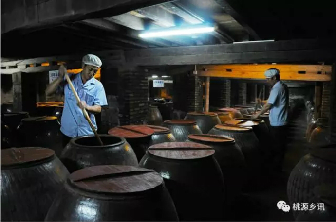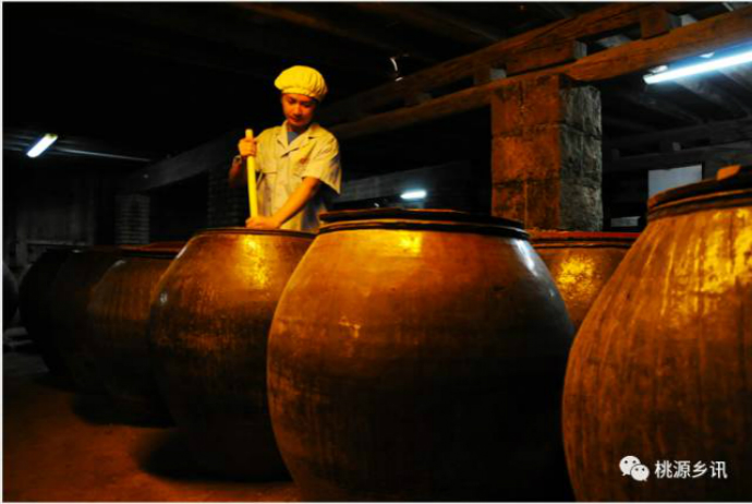 在窖藏車間,釀醋師傅在對每個陶制醋缸里的醋進行攪拌,讓缸里的醋充分吸收氧氣、活動起來,以便更好的發(fā)酵。