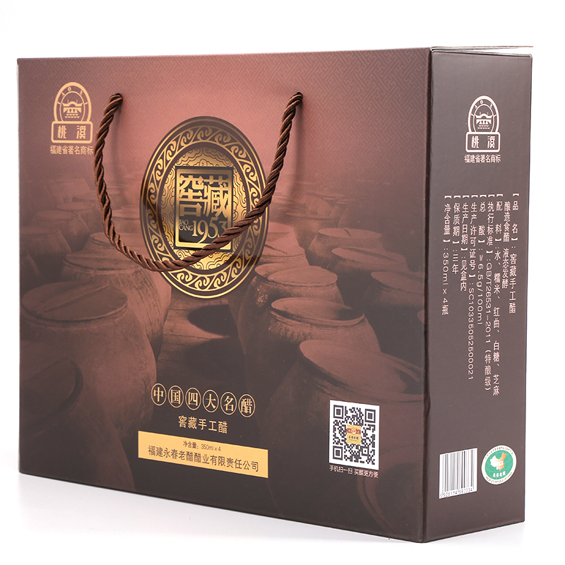 選用優(yōu)質(zhì)糯米、紅曲、芝麻、原產(chǎn)地水源等為原料,傳承千年獨(dú)特釀造工藝(液態(tài)深層發(fā)酵),純糧釀造;在半地下室的窖藏車間里,按照古法釀造工藝,純手工制醋,經(jīng)年累月,邊發(fā)酵邊陳釀,平均陳釀時間十年起,酸度6.5左右。故產(chǎn)出的老醋香味醇厚,濃酸微甜,零添加劑,回味悠長,是永春老醋中的精品。采用精美的禮盒包裝,適合送禮親朋,有禮有面!